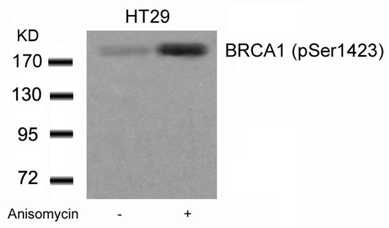 Western blot analysis of extracts from HT29 cells untreated or treated with Anisomycin using BRCA1(Phospho-Ser1423) Antibody #11242.