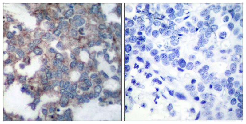 Immunohistochemical analysis of paraffin-embedded human breast carcinoma tissue using p70 S6 Kinase(Phospho-Ser424) Antibody #11284(left) or the same antibody preincubated with blocking peptide(right).