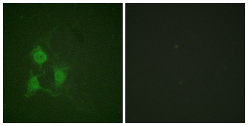 纯化Antibodies were produced by immunizing rabbits with synthetic phosphopeptide and KLH conjugates. Antibodies were purified by affinity-chromatography using epitope-specific phosphopeptide. Non-phospho specific antibodies were removed by chromatogramphy using non-phosphopeptide.