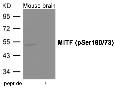 Western blot analysis of extracts from Mouse brain tissue using MITF (Phospho-Ser180/73) Antibody #12018.The lane on the right is treated with the antigen-specific peptide.