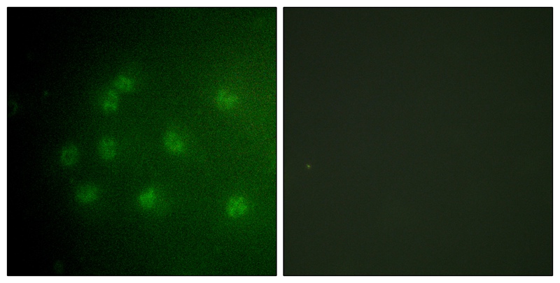 Immunofluorescence analysis of COS7 cells, using Retinoblastoma (Phospho-Thr826) antibody #12106. The picture on the right is treated with the synthesized peptide.