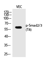 特异性Phospho-Smad2/3 (T8) Polyclonal Antibody detects endogenous levels of Smad2/3 protein only when phosphorylated at T8.