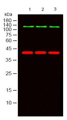 Western blot analysis of lysates from 1) 453, 2) AD293 , 3) Hela cells, (Green) primary antibody was diluted at 1:1000, 4°over night。