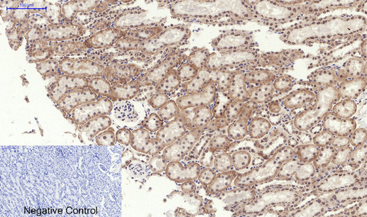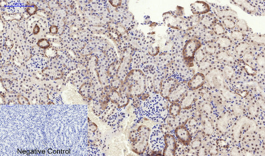 Immunohistochemical analysis of paraffin-embedded Rat-kidney tissue. Antibody was diluted at 1:200(4℃,overnight). 2, Sodium citrate pH 6.0 was used for antibody retrieval(>98℃,20min). 3,Secondary antibody was diluted at 1:200(room tempeRature, 30min). Negative control was used by secondary antibody only.