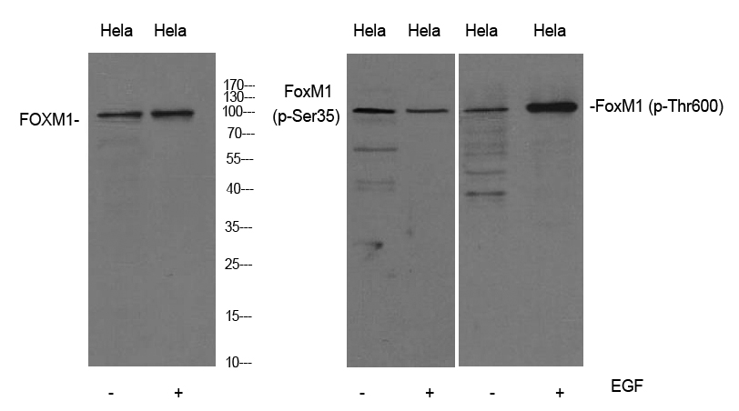 特异性Phospho-FoxM1 (Phospho-Thr600) Antibody detects endogenous levels of FoxM1 only when phosphorylated at Thr600