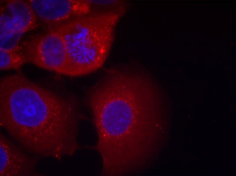 Immunofluorescence analysis of NIH/3T3 cells using GSK3 alpha Antibody(red). Blue: DAPI for nuclear staining.
