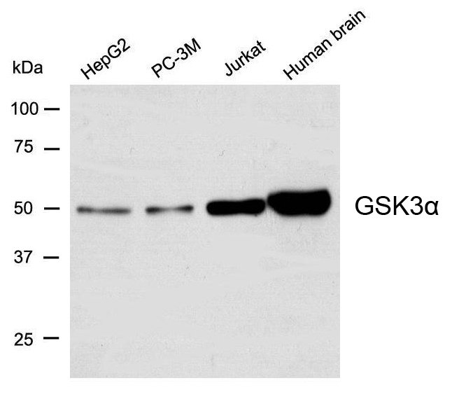 Western Blot analysis of extracts from various cell lines using GSK3 alpha Antibody.