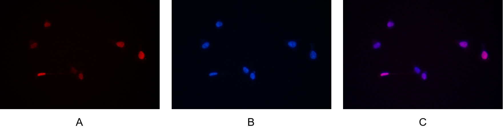 Immunofluorescence analysis of HEK293 cells using c-Jun Antibody .Picture A: c-Jun antibody (red). Picture B: DAPI (blue). Picture C: Merge of A+B