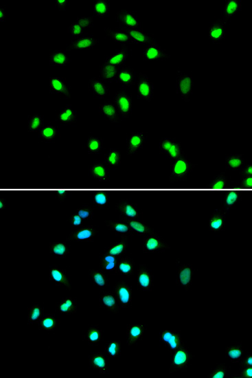 Immunofluorescence analysis of A549 cells using c-Jun Antibody. Blue: DAPI for nuclear staining.