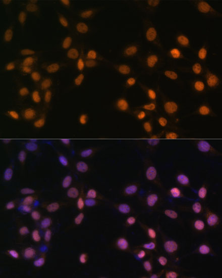 Immunofluorescence analysis of NIH/3T3 cells using c-Jun Antibody. Blue: DAPI for nuclear staining.