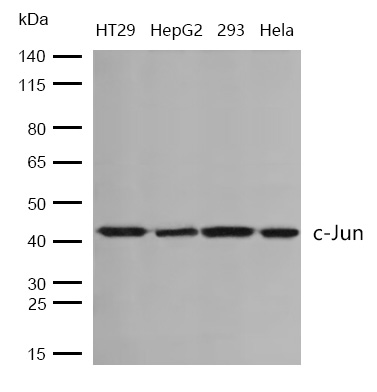 Western blot analysis of extracts from HT19, HepG2, 293 and Hela cells using c-Jun Antibody.