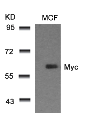 Western blot analysis of extracts from MCF cells using Myc(Ab-58) Antibody #21034.