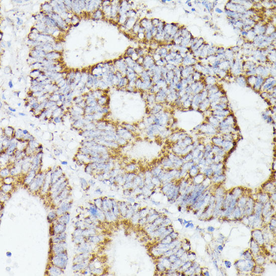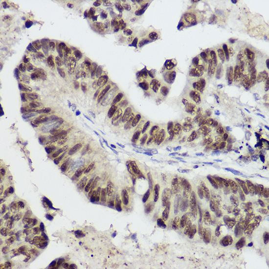 Immunohistochemistry of paraffin-embedded Human colon carcinoma using STAT1 Polyclonal Antibody.