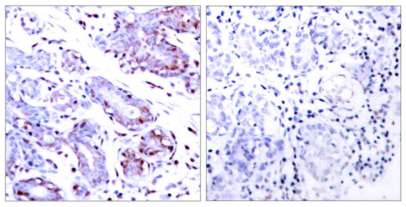 Immunohistochemical analysis of paraffin-embedded Human breast carcinoma tissue using STAT1 Polyclonal Antibody(left) or the same antibody preincubated with blocking peptide(right).