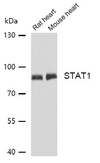 Western blot analysis of extracts from Rat heart and Mouse heart using STAT1 Polyclonal Antibody.