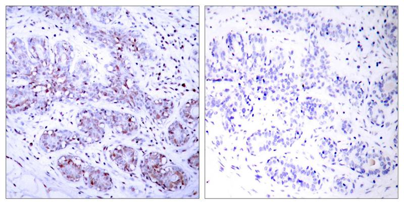 Immunohistochemical analysis of paraffin-embedded human breast carcinoma tissue using STAT4(Ab-693) Antibody #21047(left) or the same antibody preincubated with blocking peptide(right).