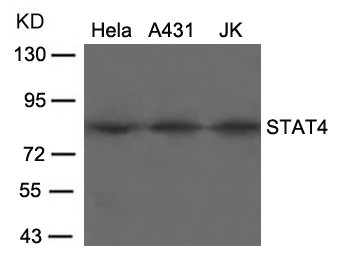 Western blot analysis of extracts from Hela, A431 and JK cells using STAT4(Ab-693) Antibody #21047.