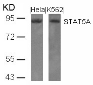 Western blot analysis of extracts from Hela and K562 cells using STAT5A(Ab-694) Antibody #21048.