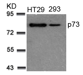 Western blot analysis of extracts from HT29 and 293 cells using p73(Ab-99) Antibody #21075.