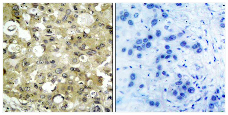 Immunohistochemical analysis of paraffin-embedded human breast carcinoma tissue using VEGFR2(Ab-951) Antibody #21079(left) or the same antibody preincubated with blocking peptide(right).