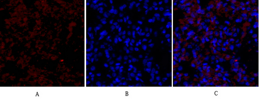 Immunofluorescence analysis of rat lung tissue using VEGFR2 Polyclonal Antibody.Picture A: Target (red). Picture B: DAPI (blue). Picture C: Merge of A+B
