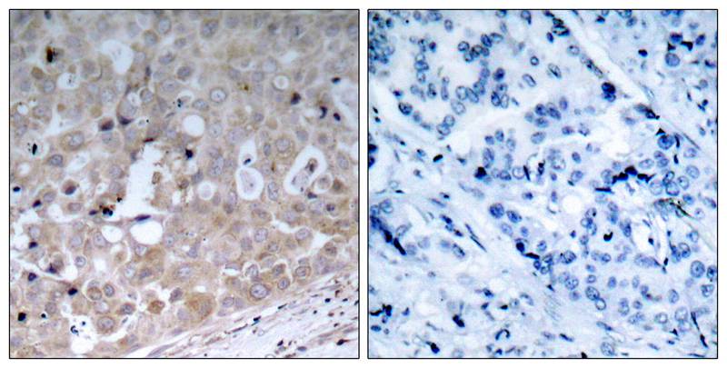 Immunohistochemical analysis of paraffin-embedded human breast carcinoma tissue using VEGFR2 Polyclonal Antibody(left) or the same antibody preincubated with blocking peptide(right).