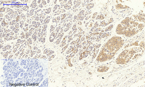 Immunohistochemical analysis of paraffin-embedded Human stomach cancer tissue using VEGFR2 Polyclonal Antibody.Negative control was used by secondary antibody only.