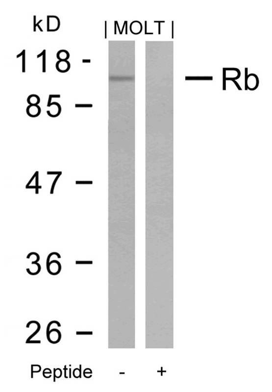 Western blot analysis of extracts from MOLT cells using Rb(Ab-795) Antibody #21108 and the same antibody preincubated with blocking peptide.