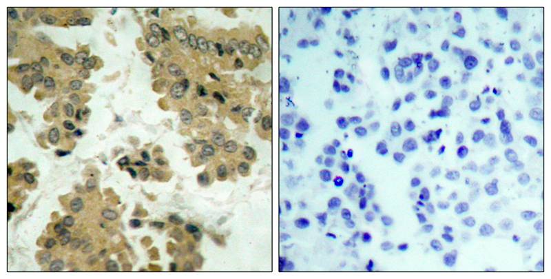 Immunohistochemical analysis of paraffin-embedded human lung carcinoma tissue using Akt2(Ab-474) Antibody #21155(left) or the same antibody preincubated with blocking peptide(right).