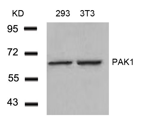 Western blot analysis of extracts from 293 and 3T3 cells using PAK1(Ab-212) Antibody #21160.