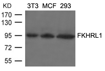 Western blot analysis of extracts from 3T3, MCF and 293 cells using FKHRL1(Ab-253) Antibody #21171.