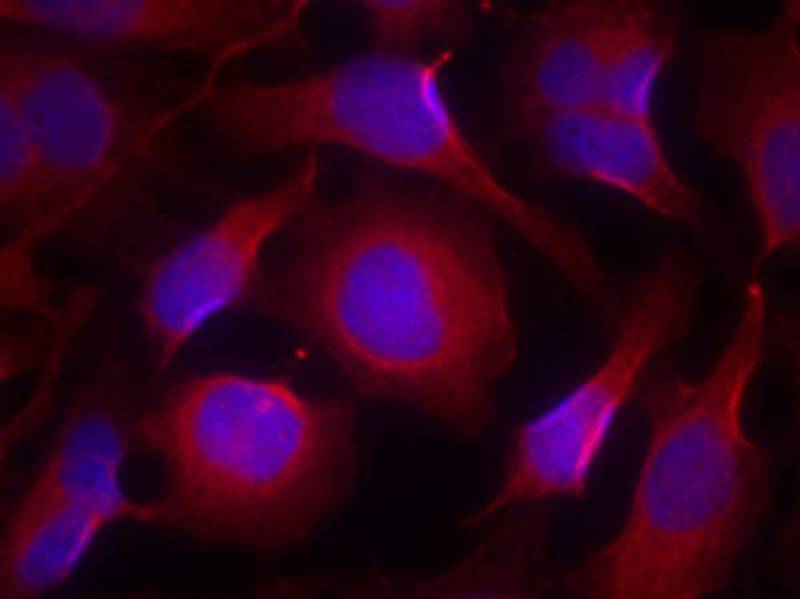 Immunofluorescence staining of methanol-fixed Hela cells using Pyk2(Ab-402) Antibody #21209.
