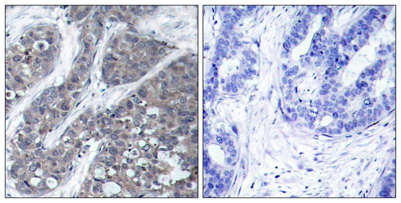 Immunohistochemical analysis of paraffin-embedded human breast carcinoma tissue using Pyk2(Ab-402) Antibody #21209(left) or the same antibody preincubated with blocking peptide(right).