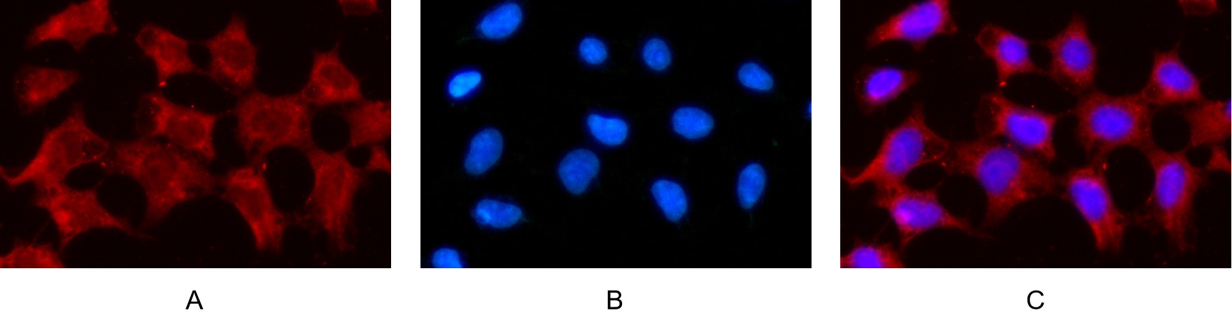 Immunofluorescence analysis of HEK293 cells using IRS-1 Antibody.Picture A: Target (red). Picture B: DAPI (blue). Picture C: Merge of A+B