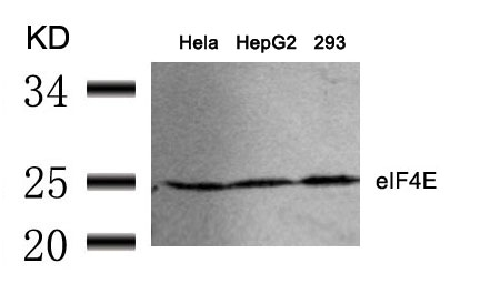 Western blot analysis of extracts from Hela, HepG2 and 293 cells using eIF4E(Ab-209) Antibody #21226.