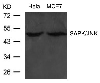 Western blot analysis of extracts from Hela and MCF cells using SAPK/JNK(Ab-183) Antibody #21241.