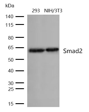 Western blot analysis of extracts from 293 and NIH-3T3 cells using Smad2 Polyclonal Antibody.