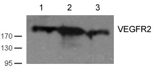 Western blot analysis of cell lysates using VEGFR2(Ab-1059) antibody(#21531) Lane 1 and 2: Huvec cell; Lane 3 HT29 cell)