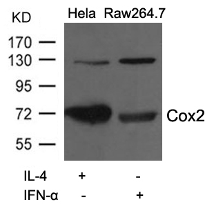 Western blot analysis of extracts from Hela cells treated with IL-4 and Raw264.7 cells treated with IFN-¦Á using Cox2 Antibody #21679.