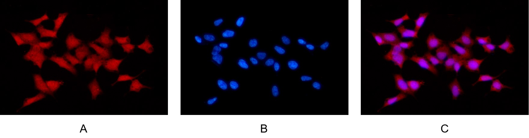 Immunofluorescence analysis of HEK293 cells using Smad1/Smad5/Smad8 Antibody. Picture A:Target (red). Picture B: DAPI (blue). Picture C: Merge of A+B