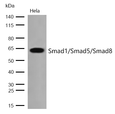 Western blot analysis of extracts from Hela cells using Smad1/Smad5/Smad8 Antibody.