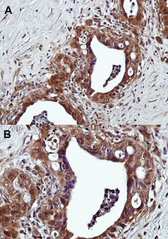 A:Immunohistochemical analysis of paraffin-embedded Human prostate adenocarcinoma, using GPR120 antibody at 1: 500 dilution.(20X). B:Immunohistochemical analysis of paraffin-embedded Human prostate adenocarcinoma, using GPR120 antibody at 1: 500 dilution.(40X)