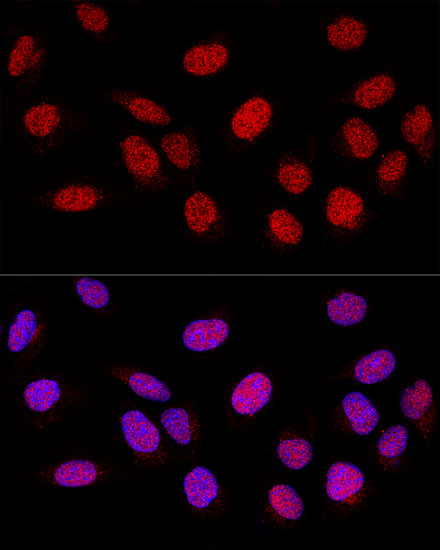 Confocal immunofluorescence analysis of U-2 OS cells using PARP1 Polyclonal antibody at dilution of 1:200. Blue: DAPI for nuclear staining.