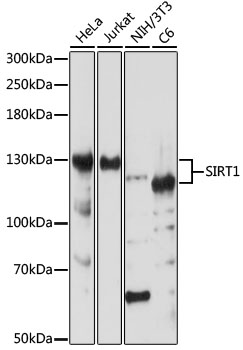 Western blot analysis of extracts of various cell lines, using SIRT1 antibody.