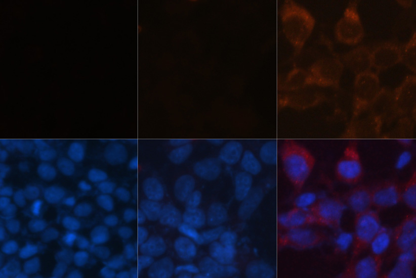 Immunofluorescence analysis of LC3B knockout 293T cells treated by chloroquine and wild-type 293T cells ��wild-type 293T cells treated by chloroquine using LC3B Rabbit pAb at dilution of 1:100. Blue: DAPI for nuclear staining.