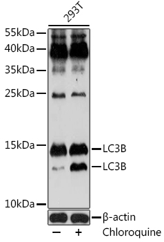 Western blot analysis of extracts of 293T cells, using LC3B antibody at 1:1000 dilution.293T cells were treated by Chloroquine at 37�� for 20 hours.