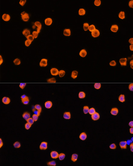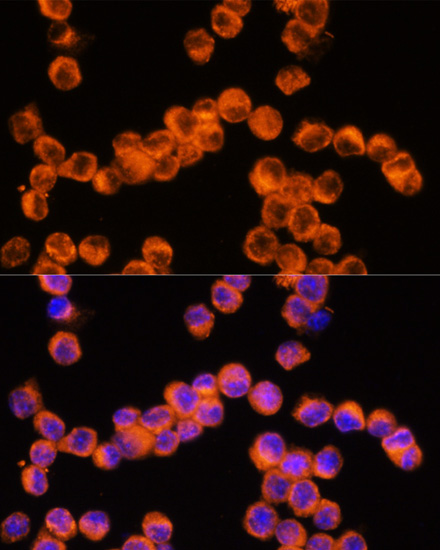 Immunofluorescence analysis of Raw264.7 cells using NLRP3 antibody at dilution of 1:100. Blue: DAPI for nuclear staining.