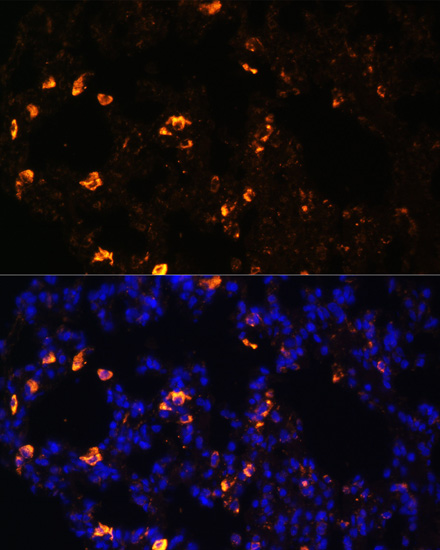Immunofluorescence analysis of rat lung cells using NLRP3 antibody at dilution of 1:100. Blue: DAPI for nuclear staining.