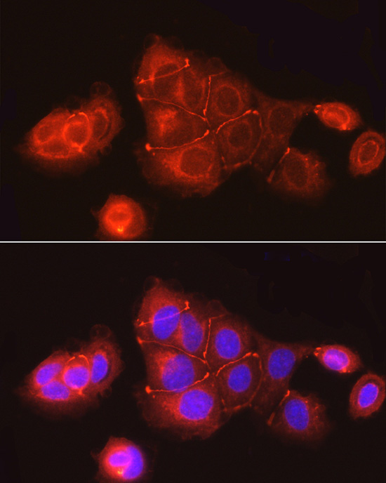 Immunofluorescence analysis of MCF7 cells using ZO-1 Rabbit pAb at dilution of 1:150 (40x lens). Blue: DAPI for nuclear staining.