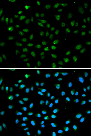 Immunofluorescence analysis of A549 cell using ATF6 antibody. Blue: DAPI for nuclear staining